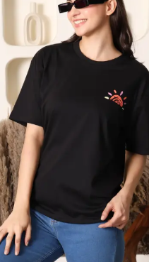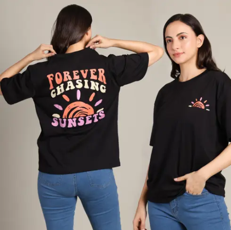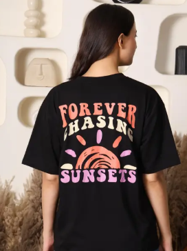 Chase golden hours in style with our Forever Chasing Sunsets oversized t-shirt for women. Made from soft black cotton, this comfy tee features a stunning multicolor sunset print on both the front and back — perfect for travel lovers, beach days, and everyday adventures. Its relaxed fit gives you all-day comfort while making a bold style statement. Whether you’re exploring new places or just soaking in the vibes, this travel-inspired t-shirt is made for dreamers who are always chasing the next sunset.
